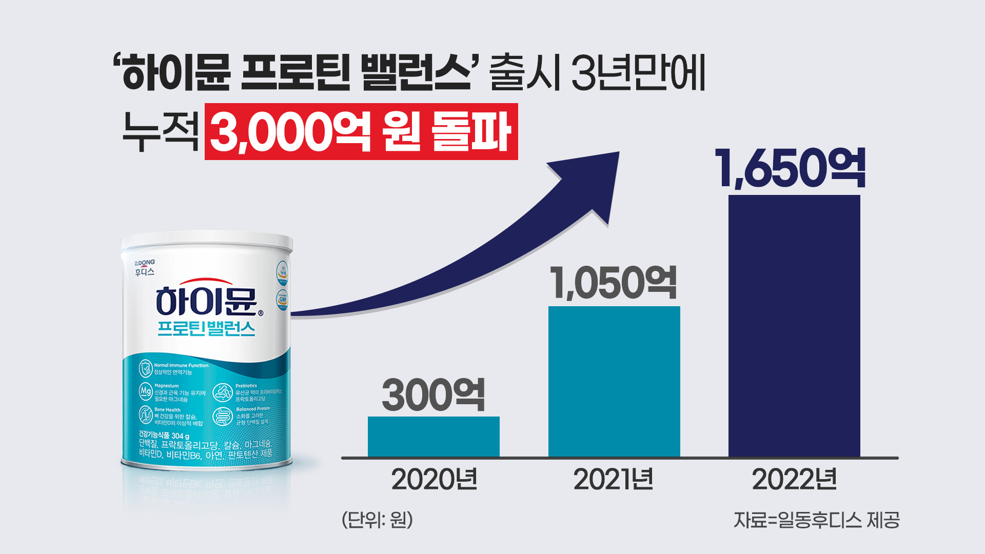 지난 2020년 2월 출시 이후 ‘하이뮨 프로틴 밸런스’는 매년 성장세를 거듭해 왔다. 출시 첫 해 매출 300억 원, 2021년은 1,050억 원에서 2022년에는 1,650억 원을 넘어서며 3년간 누적 매출 3,000억 원을 돌파, 국내 단백질 시장 1위를 지키고 있다.