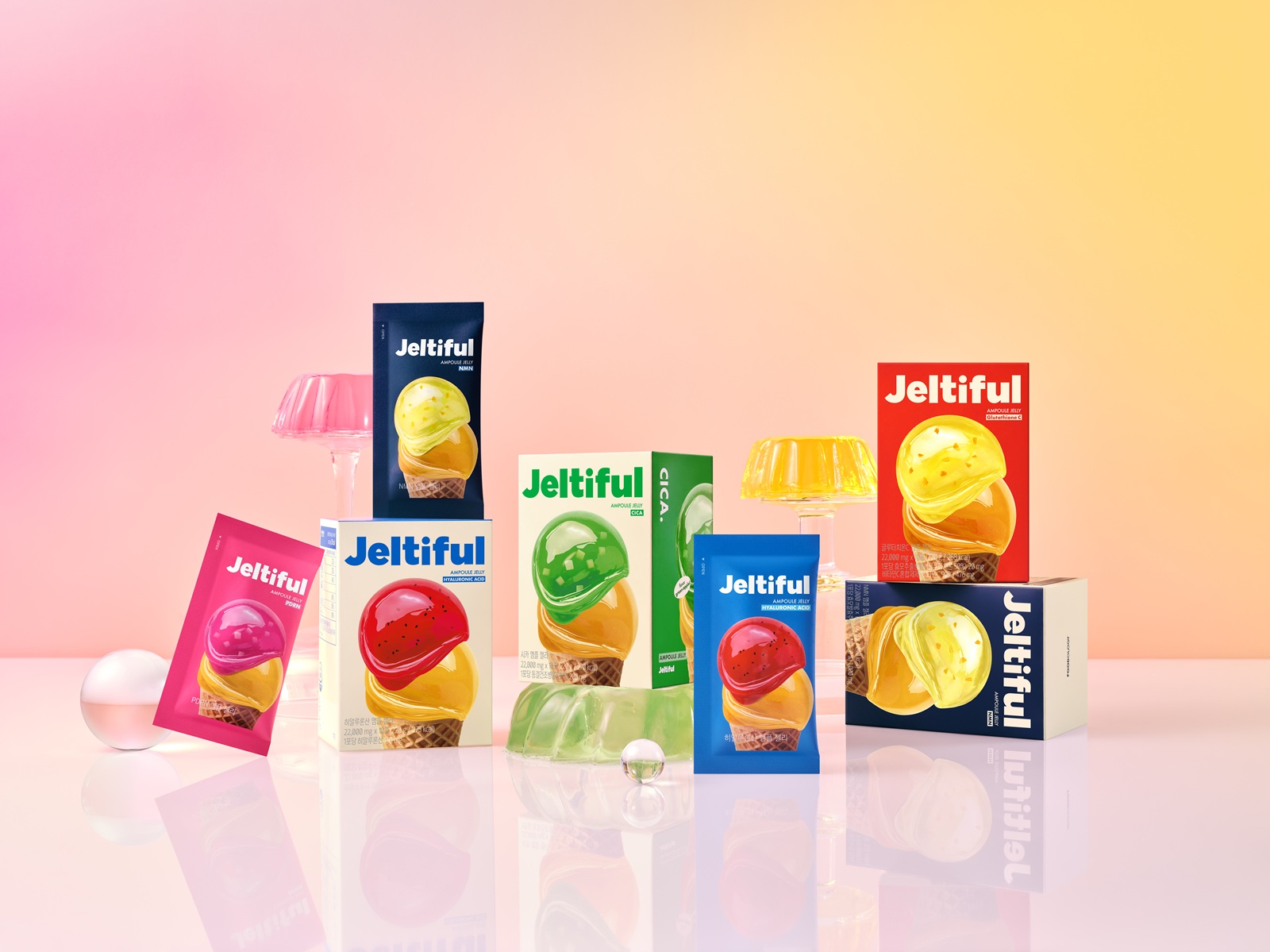 젤티풀의 앰플 젤리는 성분별 맞춤 뷰티 솔루션을 제안하며 ‘PDRN 앰플 젤리’, ‘글루타치온C 앰플 젤리’, ‘히알루론산 앰플 젤리’, ‘시카 앰플 젤리’, ‘NMN 앰플 젤리’ 등 총 5종으로 출시돼 고객의 피부 고민에 따른 ‘선택형 맞춤 설계’를 제안한다.