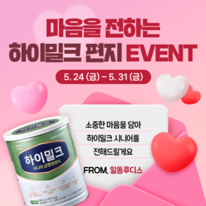 소중한 마음이 오가는 5월, 아직 표현하지 못한 마음이 있는 이들을 위한 SNS 이벤트 댓글 작성만으로 쉽게 참여 가능..추첨 통해 신제품 고령자용 영양조제식품 ‘하이밀크 시니어 균형영양식’ 증정 (2024-05-30) 일동후디스가 가정의 달을 맞아 ‘마음을 전하는 하이밀크 편지’ SNS 이벤트를 오는 31일까지 진행한다. 이번 이벤트는 소중한 마음이 오고 가는 5월 가정의 달, 마음을 아직 표현하지 못한 이들을 위해...p>
