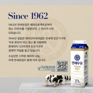 연세유업 역사의 시작, ‘헤퍼’의 가치를 이어받아 ‘나눔의 선순환’ 실천 패키지 삽입된 QR코드 스캔 시 네팔로 보낸 젖소 사료 후원방글라데시 학생 무료 급식 후원 등에 동참 가능 연세대학교 연세유업이 62년 전통과 헤리티지를 강조해 대대적인 패키지 리뉴얼을 진행한다고 18일 밝혔다. 연세유업 역사의 시작은 국제 NGO단체 ‘헤퍼 인터내셔널(Heifer International)’이 기증한 젖소 10두였다. 이 단체는 ‘물고기를 주는 대신 물고기...p>