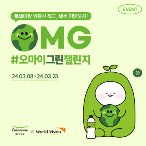 – 인스타그램 인증샷 목표 게시물 수 달성 시 월드비전 ‘꿈꾸는 아카데미’에 생수 2천 병 기부 – 나눔문화 확산 위한 챌린지 참여자 대상 이벤트 진행…다양한 사은품 증정 – 먹는샘물 주요 제품 최대 34% 할인하는 프로모션도 진행 풀무원 계열의 풀무원샘물(대표 정희련)이 ‘세계 물의 날’을 기념해 ‘오마이그린(Oh My Green, 이하 OMG) 챌린지’ 캠페인을 진행한다고 19일 밝혔다. 3월 22일...p>
