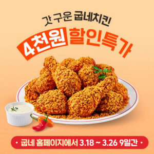 – 굽네 인기 메뉴 고추바사삭·맵단짠 칩킨·볼케이노·불금치킨·고추바사삭+바질&토마토피자 할인하는 ‘굽위크 프로모션’ – 새봄맞이 기념해 오는 3월 18일부터 26일까지 9일간 굽네 공식 홈페이지에서 회원 주문 시 4천 원 할인 적용 (2024-03-18) 지앤푸드의 오븐요리 프랜차이즈 굽네(대표 정태용)가 새봄을 맞아 오는 18일부터 굽네 공식 홈페이지에서 인기 메뉴를 할인가에 만나볼 수 있는 ‘굽위크 프로모션’을 진행한다. 굽위크(Goobweek) 프로모션은 따뜻한 봄이자 새 학기...p>