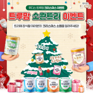 오는 20일(수)까지 일동후디스 트루맘 공식 인스타그램 계정에서 진행 당첨자 대상 트루맘 영양식, 트루맘 뉴클래스 액상분유, 커피쿠폰 등 증정 (2023-12-15) 일동후디스 트루맘이 우리 아이와 함께하는 행복한 크리스마스를 위해 오는 20일(수)까지 소원 트리 SNS 이벤트를 진행한다고 밝혔다. 이번 이벤트는 사랑하는 우리 아이와 함께 소원을 빌어보며 설레는 크리스마스를 기다리는 마음을 담아 기획했다. 이벤트 참여 방법은 후디스 트루맘 인스타그램...p>