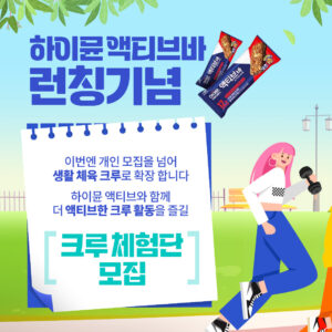 오는 19일(화)까지 하이뮨 액티브 공식 인스타그램 프로필 링크 통해 신청 언제 어디서나 간편하게 섭취 가능한 고단백 에너지바로 액티브한 크루 활동 즐겨 (2023-12-13) 일동후디스가 오는 19일(화)까지 ‘하이뮨 액티브바’ 3차 체험단 모집을 진행한다고 13일 밝혔다. 이번 캠페인은 ‘생활 체육 크루와 함께 즐기는 하이뮨 액티브바’를 콘셉으로, 액티브한 운동 및 취미 생활을 즐기는 생활 체육 크루에게 제품 체험 기회를...p>