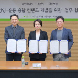 – 23일 수서 풀무원 본사서 3사 협약식…풀무원 디자인밀 중심으로 헬스케어 사업 공동추진 – 식단과 운동 콘텐츠 결합하여 고객 건강 상태에 맞춘 최적의 식단·운동방법 제공할 것 풀무원(대표 이효율)은 지난 23일 서울 수서 풀무원 본사서 마이베네핏(대표 정석모, 권희진), 닥터엑솔(대표 송욱)과 ‘헬스케어 융합 콘텐츠 제작 및 통합 플랫폼 구축을 위한 업무협약(MOU)’을 체결했다고 24일 밝혔다. 풀무원은 디자인밀의 통합 헬스케어...p>