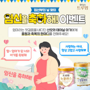 임산부 위한 깜짝 이벤트..직접 남긴 메시지 담긴 축하 편지, 꽃다발 등 선물 배송 오는 12일까지 후디스 트루맘 공식 인스타그램 통해 진행 (2023-10-06) 일동후디스 트루맘이 ‘임산부의 날’을 맞아 오는 12일까지 ‘임신을 축하해!’ 이벤트를 진행한다고 밝혔다. 10월 10일은 임산부의 날로 임신과 출산에 대한 긍정적인 인식을 통해 임산부를 배려, 보호하는 사회적인 분위기를 만들기 위해 모자보건법에 의거해 제정된 날이다....p>