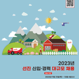 영업 · IT 기술 등 6개 부문 29개 직무 인재 채용 이달 21일부터 10월 4일까지 선진 채용 사이트에서 서류 접수 스마트 축산식품전문 기업 선진(총괄사장 이범권)이 2023년 하반기 대규모 신입•경력사원 채용을 실시한다고 밝혔다. 올해 50주년을 맞은 선진은 미래 경쟁력을 강화하기 위해 축산식품 사업의 전 분야에 걸쳐 인재를 확보한다. 특히 지속가능한 축산업과 스마트한 업무 환경을 만들어 내기...p>