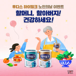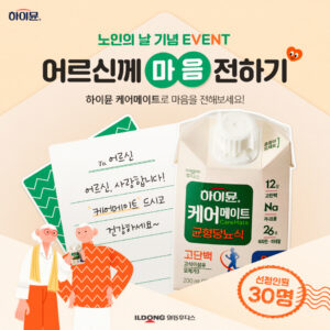 일동후디스, 노인의 날 기념 어르신들께 따뜻한 마음과 건강 선물 기회 마련 하이뮨 케어메이트..한 팩으로 고단백 균형 영양 섭취할 수 있어 어르신들 선물로 제격 (2023-10-04) 일동후디스가 노인의 날을 맞아 오는 9일까지 어르신들께 하이뮨 케어메이트와 함께 마음을 전할 수 있는 SNS 이벤트를 진행한다고 밝혔다. 노인의 날은 노인에 대한 공경과 감사하는 마음을 새기며, 그분들의 노고를 치하하기 위해 제정한...p>