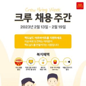 맥도날드, 2023년 첫 ‘크루 채용 주간’ 진행…올해도 적극 채용 이어간다 맥도날드, 학력·나이·성별·장애 등에 차별을 두지 않는 ‘열린 채용’ 방식의 대규모 채용 진행 체계적인 교육 시스템을 기반으로 근무 성과에 따라 향후 정규직 전환 기회 제공 정기 건강검진, 경조사 지원, 초특가몰 등 ‘사람 중심’ 철학을 바탕으로 한 다양한 복지 혜택 제공 맥도날드가 오는 19일까지 약 일주일 간...p>